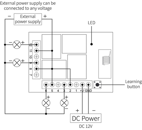 2CH Latching + 2CH Latched: Press the learning key on the receiver board 7 times (LED Indicator on receiver board will flash simultaneously), then press any key on the remote control, LED indicator on the receive flashes 3 times indicates pair successfully.