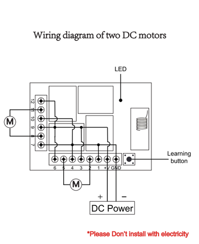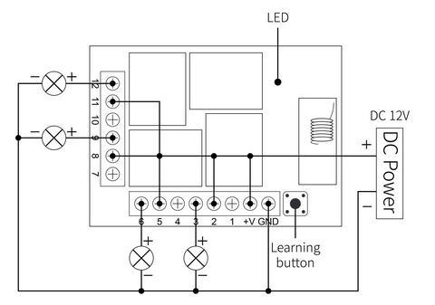 2CH Momentary + 2CH Toggle: Appuyez 4 fois sur le bouton d'apprentissage sur la carte du récepteur (le voyant LED sur la carte du récepteur clignotera en même temps), puis appuyez sur n'importe quel bouton de la télécommande, le voyant LED sur le récepteur clignote 3 fois L'appairage est réussi.